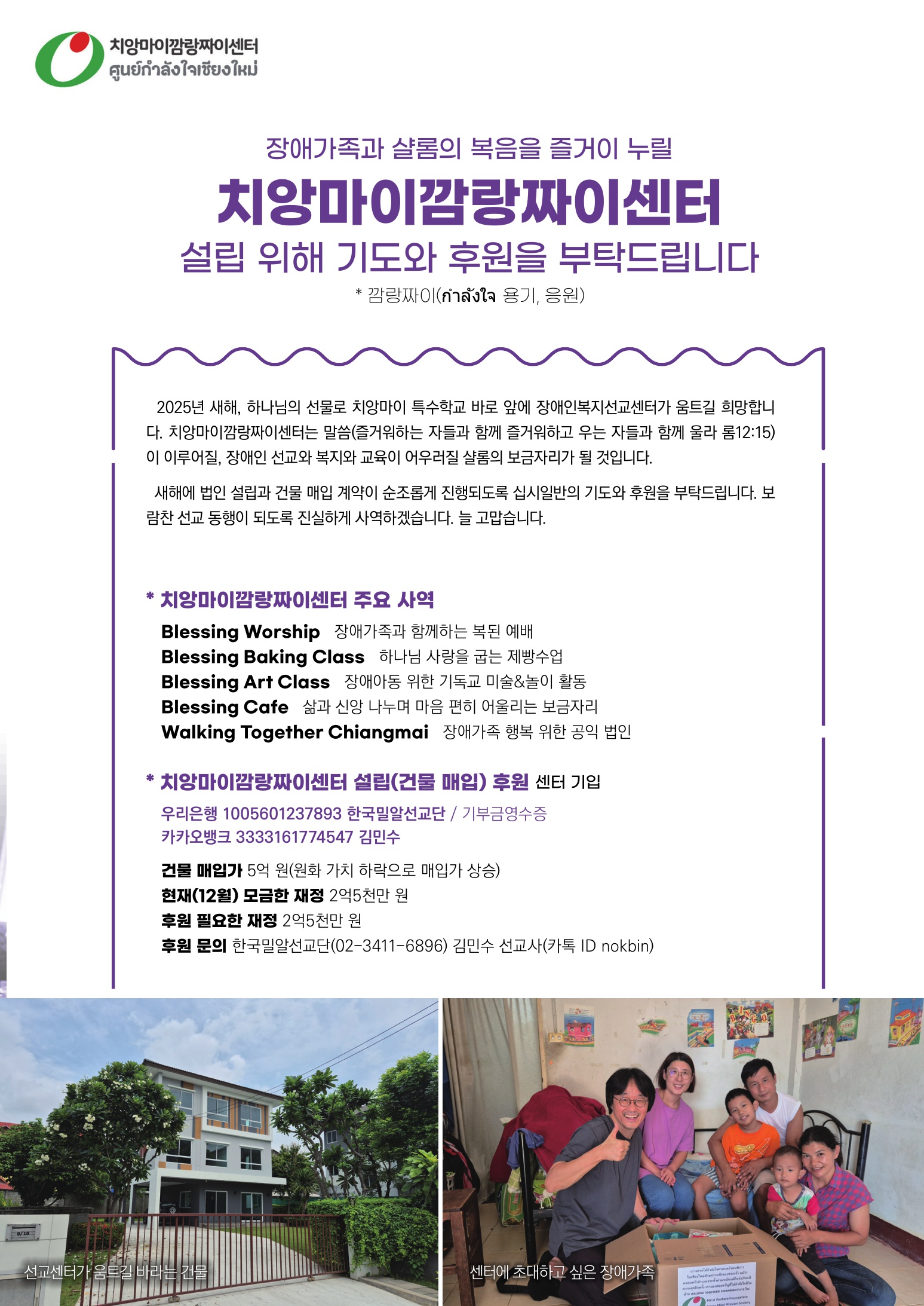 * 사역비 치앙마이 장애인복지선교 진행비, 치앙마이깜랑짜이센터 설립비(법인 설립, 건물 매입, 설비 및 인테리어 등)