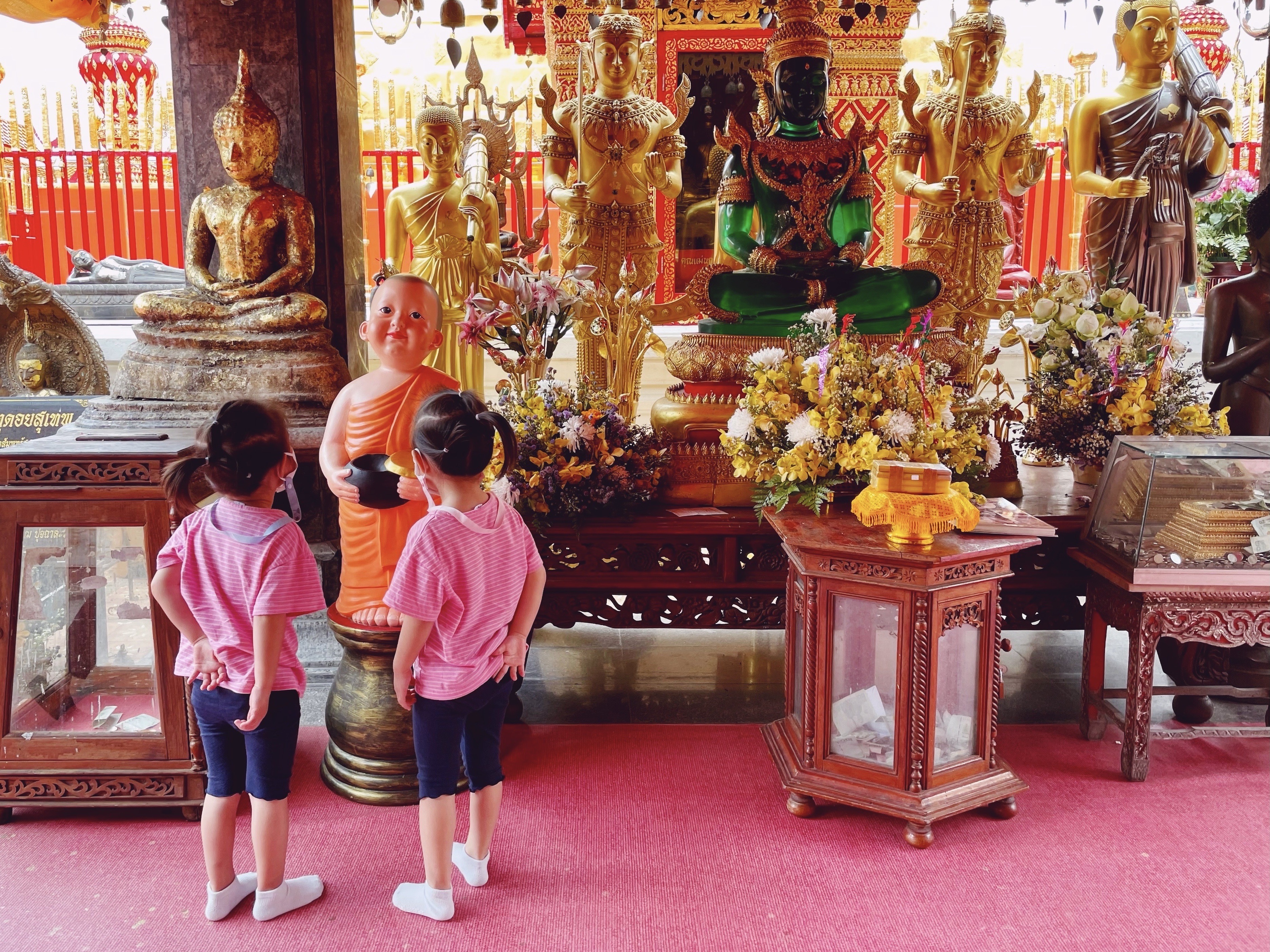 요람에서 무덤까지, 그 이전과 이후까지 태국인은 불교를 숭상합니다. 불교 사상의 두 축은 업보(業報)와 윤회(輪廻)입니다. 이생의 고통은 전생에서 공덕을 쌓지 않았기 때문입니다. 다음 생의 안녕을 위해 무단히 공덕을 쌓습니다. 공덕을 쌓는 주요 대상은 절과 중, 그리고 거리와 상점과 가정에 있는 신당입니다. 하하자매도 곳곳에 있는 산당을 신기해합니다.