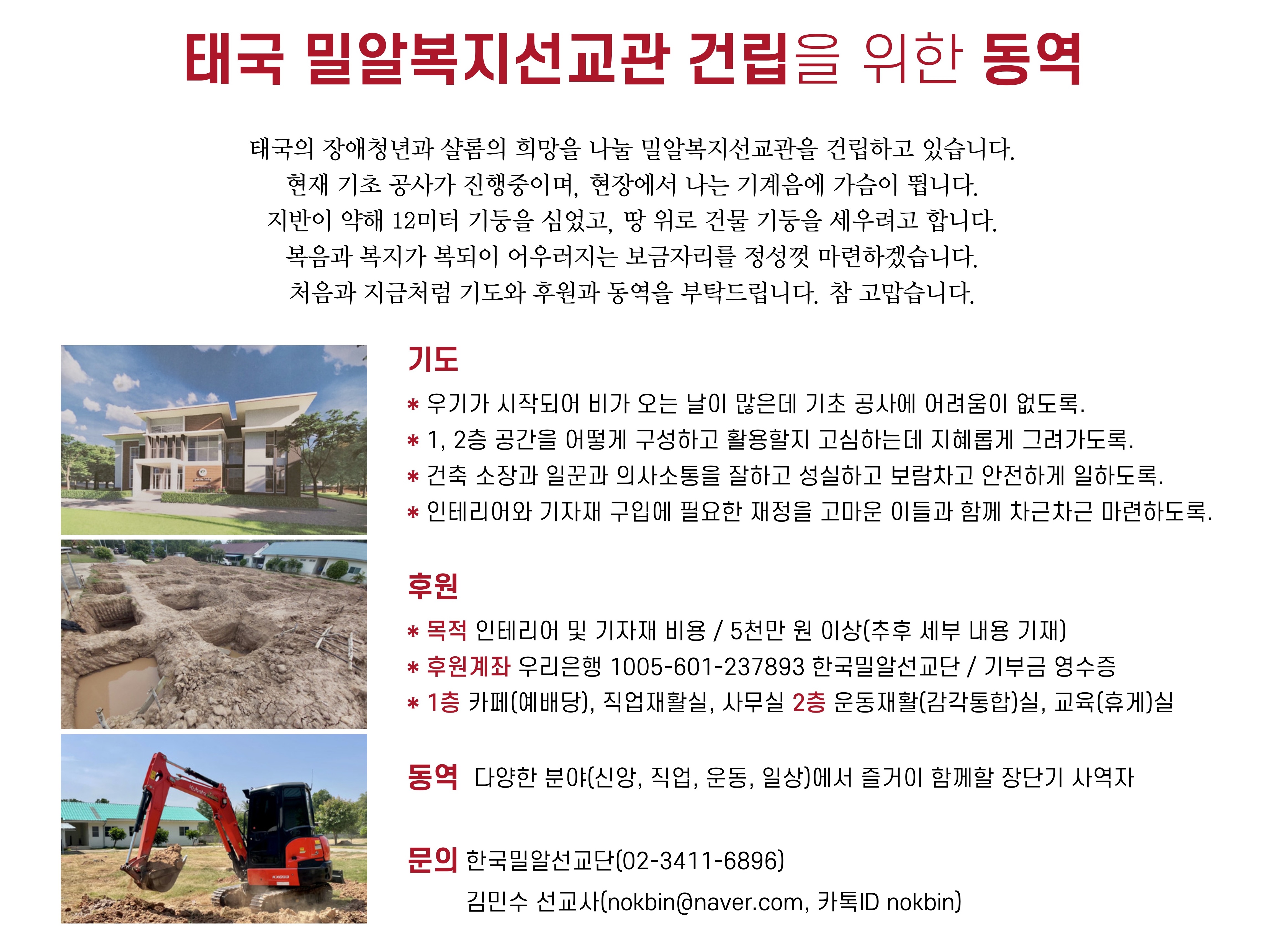 비가 많이 오는 태국에서는 기초 공사가 무척 중요합니다. 복음과 복지가 복되이 어우러지는 보금자리를 정성껏 마련하겠습니다. 처음과 지금처럼 기도와 응원을 부탁드립니다. 여러분이 큰복터에 마실 와서 밀알복지선교관 카페에 거할 날을 만나고 싶습니다.